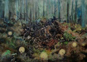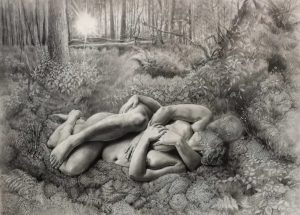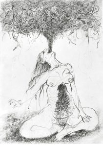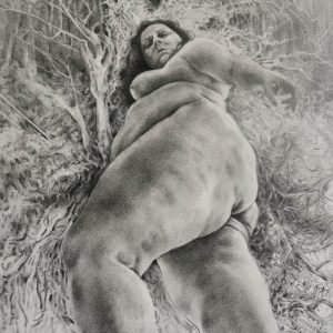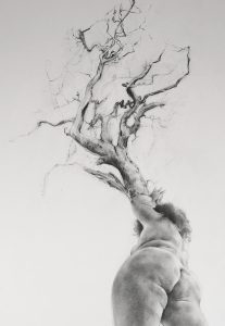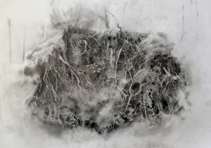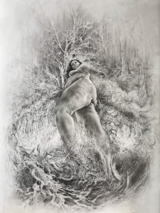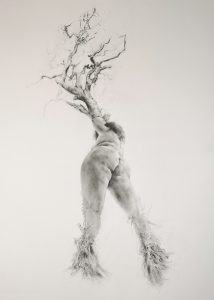 Emergence is an ongoing body of work , which tells the story of how the onset of chronic mental and physical illness, led to what is referred to as ‘a dark night of the soul’. It is the story of a metaphorical death of the self, followed by a spiritual awakening to the power of the earth, and the power within oneself, as part of nature. The works themselves are intensely detailed and visceral graphite drawings, exploring the complex connection humans have with our natural environment. The drawings posit the bodily self becoming/emerging from nature and in turn returning to the earth itself.