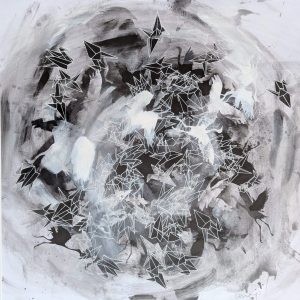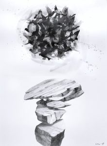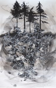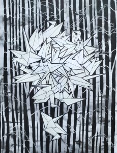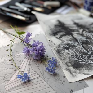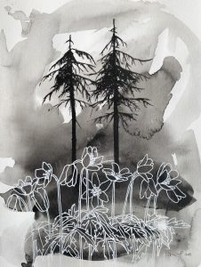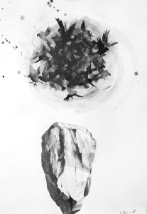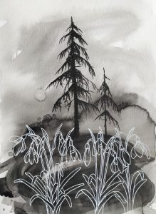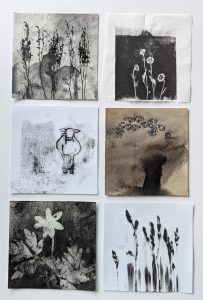 My practice consists of painting and drawing, and various types of print making and stencilling. I have since moving to the UK always engaged with concepts of ‘belonging’ and ‘home’ in various forms. The natural environments in rural Sweden where I grew up, alongside those of my Scottish home – from urban green spaces to the inner hebrides and the highlands – allow me to make connections and gives a sense of belonging across places and times. I aim to evoke some of the melancholy of evergreen conifer forests, the fragile transient energy of seasonal plants, and the change of the seasons in ancient landscapes. Those landscapes are also rooted in the history of their people: In particular stories of emigration interest me, and are very present to me when creating and finding links between Scottish natural and rural landscapes, and the place where I grew up. Birds often come to signify migration and the contrasts between displacement, shared purpose, and belonging to the land.