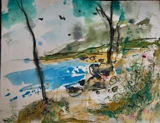 Her latest artworks use mixed media applied to various papers including Indian recycled handmade paper. Her work is often a response to the sea and other bodies of water which is reflected in her palette.