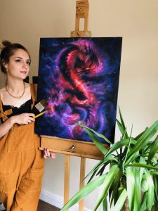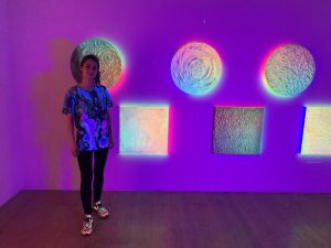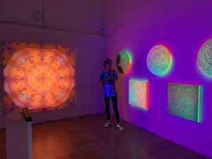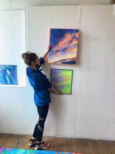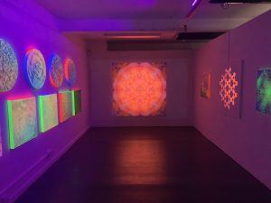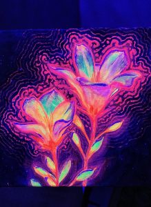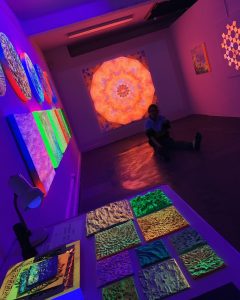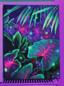 My current work is creating immersive paintings using fluorescent pigments, that glow under UV. The paintings change colour under different lighting conditions, bringing another layer of perspective and interactivity to the art.
