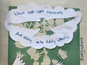 focussed on nesting and family, another the swooping dancing flight of the skylark and another developed an artwork which was a memorial of words and image for a friend who had died. One young participant created an image and words about climate change – uppermost in her mind. Hers was a unique and exceptional response. – she had cut the flying skylark in half. It was such a strong and moving image reflecting the damage to nature and biodiversity from climate change.