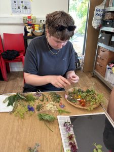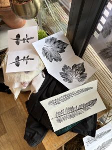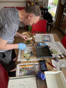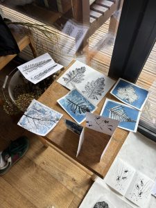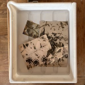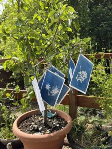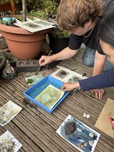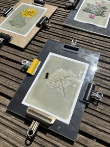 Week 4 was monoprinting with plants and experimental cyanotype, using water and soil. Participants collected plants thinking about textures and shape which they then inked up and printed onto paper. It’s a remarkably effective printing technique that doesn’t require a press.