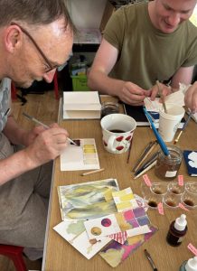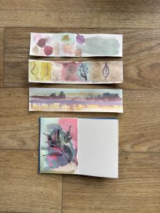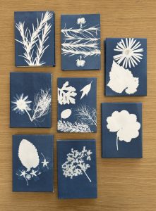 Week 1 was Cyanotype concertina books, with the idea of adding artwork to the book pages as the weeks progressed. Covers were printed outside in the sun, then the books folded and covers attached.